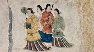 壁画には、男性と女性の貴族の姿が描かれており、当時の服装が細かく再現されています。男性は冠をかぶり、長い袖のついた衣装を着ています。女性は、カラフルな長衣(ちょうい)と裙(くん)をまとい、髪を高く結い上げています。