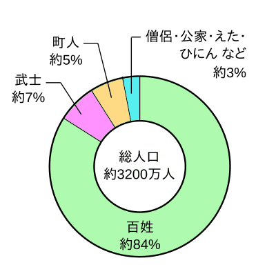 - 武士は支配層で、百姓(農民)は食料生産を、町人(商人・職人)は経済活動を担当した。