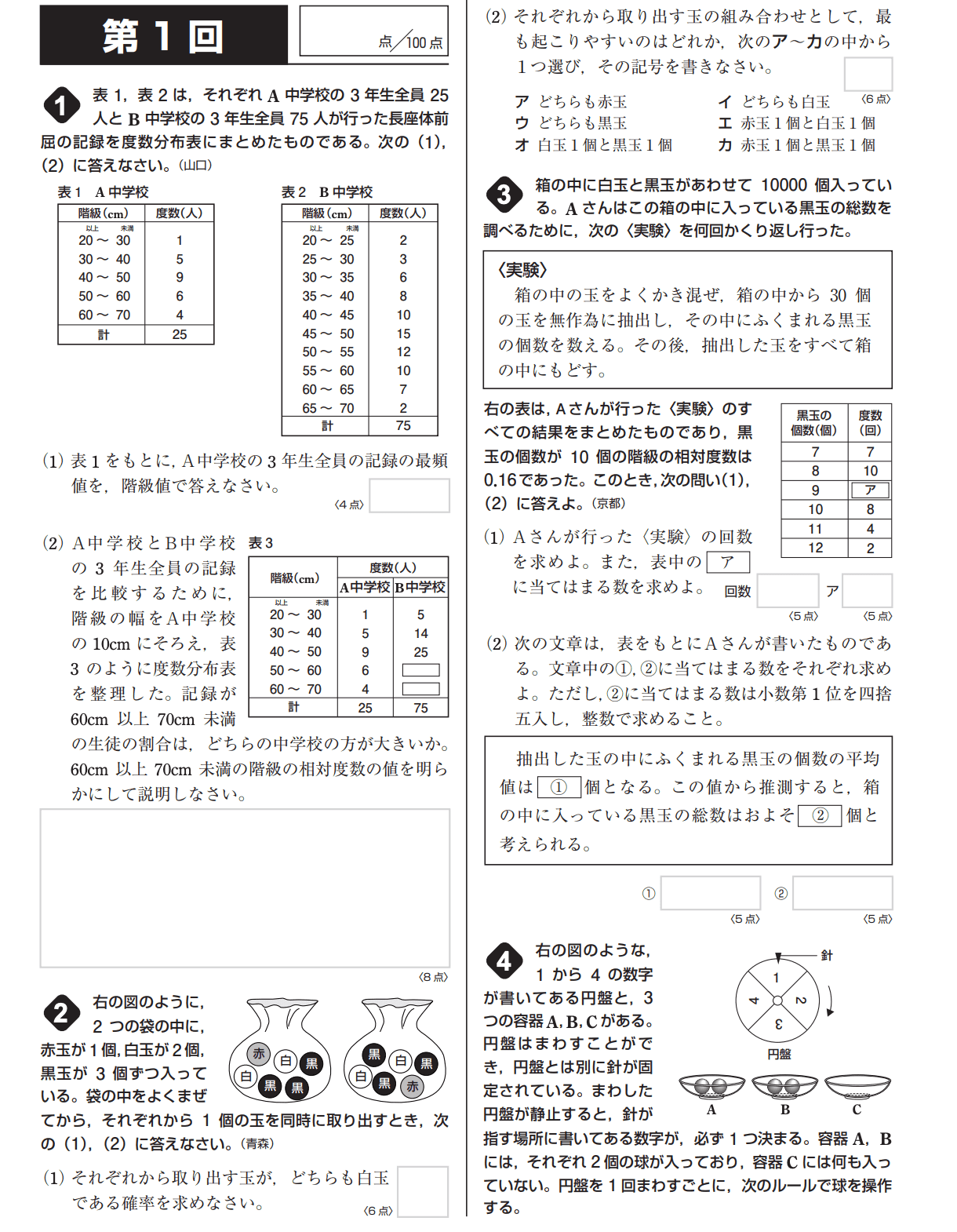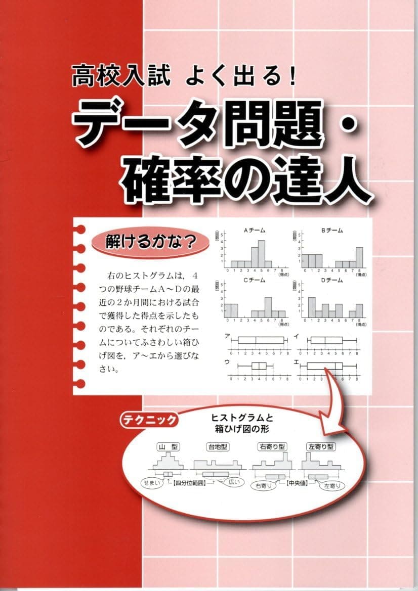 よって、ある程度基礎がために自信が持てるようになると、「データ問題・確率の達人」という大問特化受験問題集をやるのがおすすめです。
