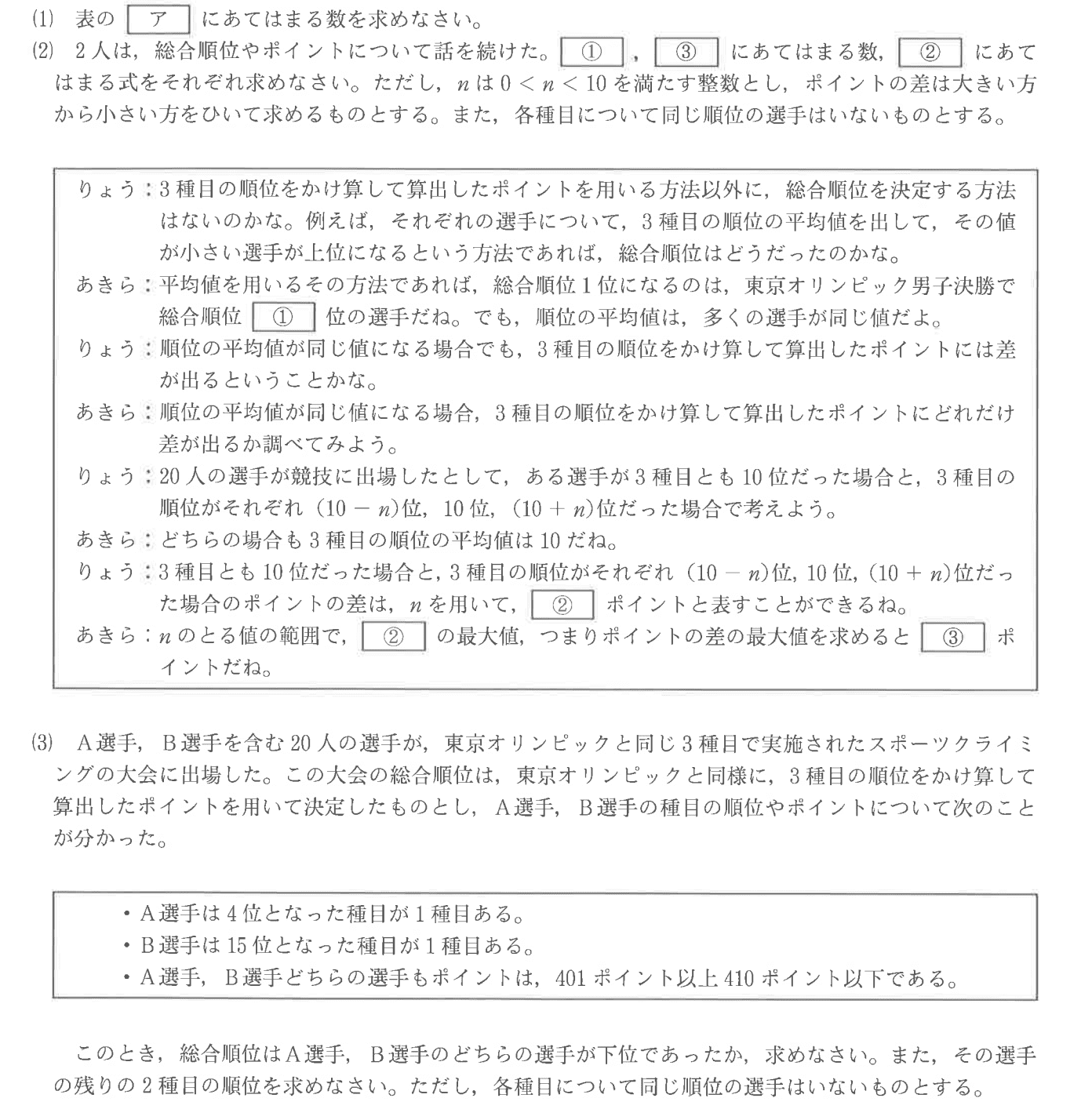 正直、最後の大問はモロに子供の地頭チェックみたいになっています。会話形式の長い文章を読ませて、状況を読み込み、流れに従って問題に答えていくタイプです。共通テストを完全に意識しており、対策やパターンでは解けないように工夫されています。