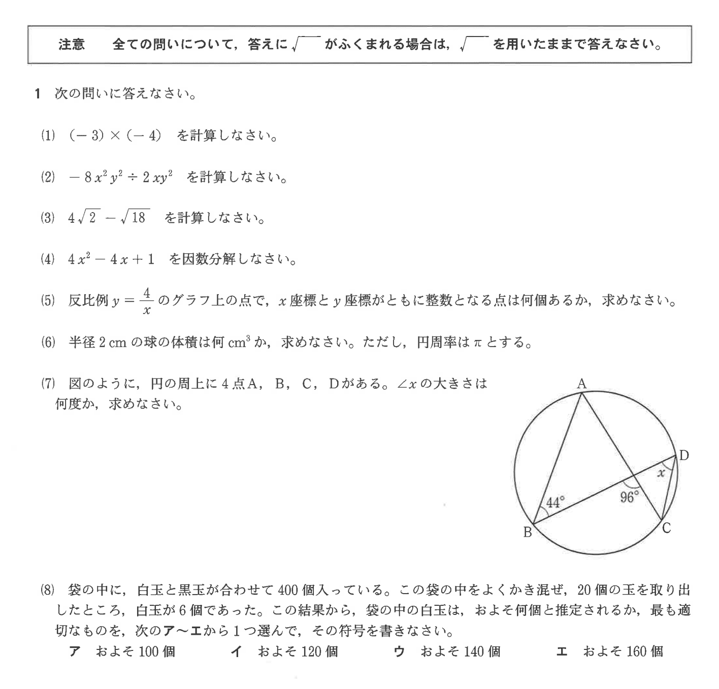 まず、兵庫県では長年にわたり大問1は「小問集合」です。参考までに令和7年度の大問1を載せておくと、以下の通りです。