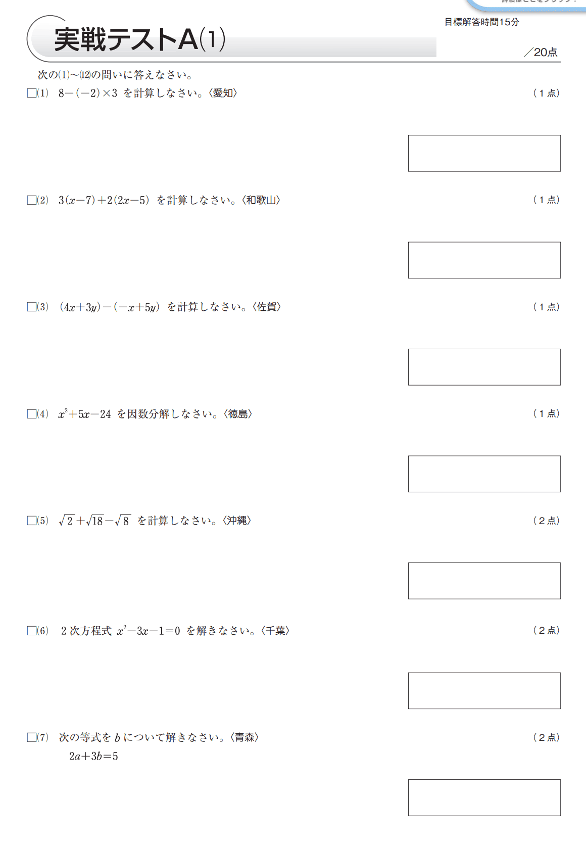 こちらは、1ページが1セットで毎回5題シャッフル問題が演習できます。回数を重ねるごとに難易度が上がり、出題範囲も3年生の割合が増えてきます。前半は中3範囲をほぼ含まないので、中3の夏休みから使えます。