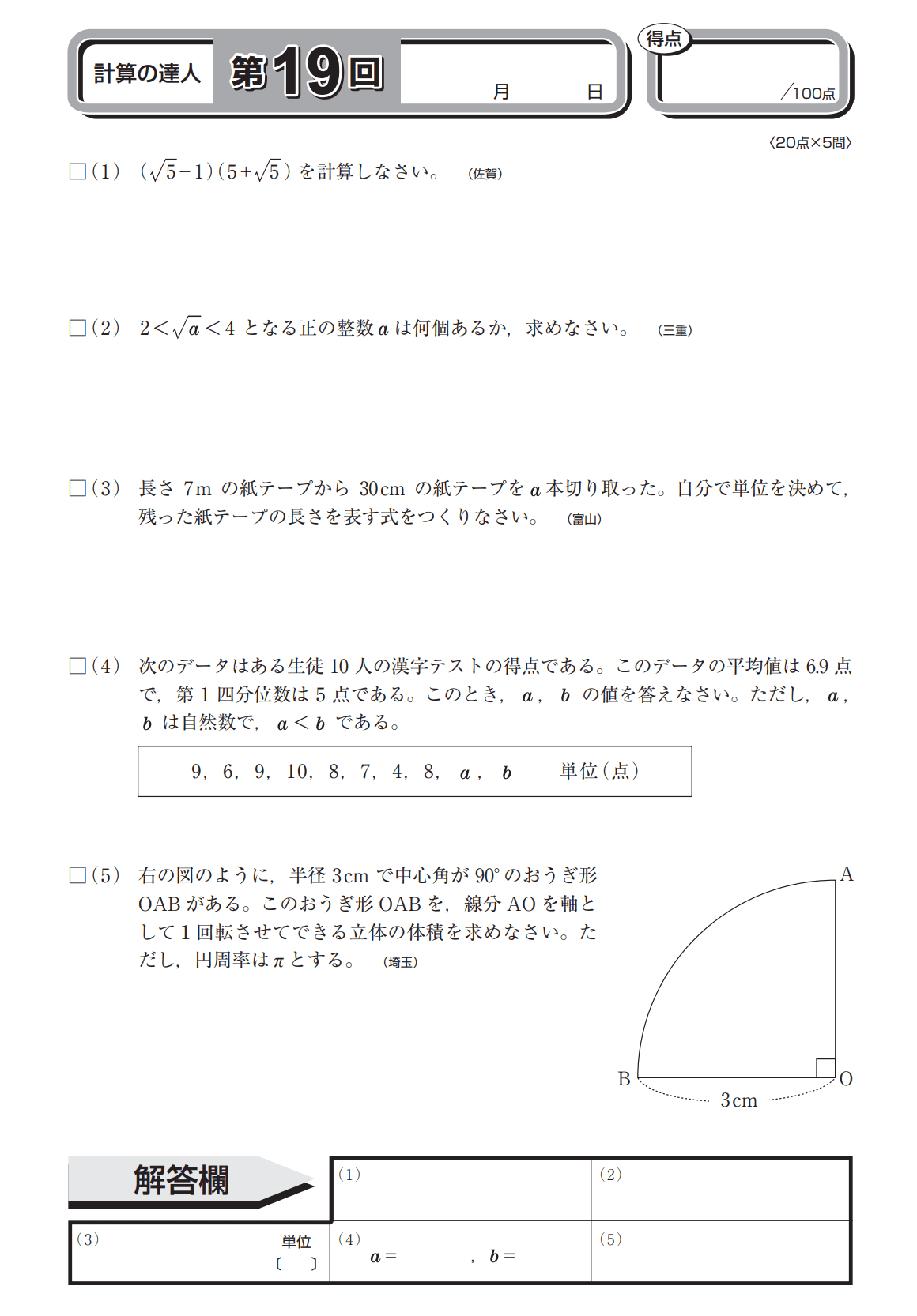 「大問1の完成」は全国の都道府県の小問集合のみを集めたシャッフル問題集です。見開き1ページがセットになっていて、正の数・負の数の計算、方程式、図形問題、確率問題などあらゆるジャンルの問題を1ページにシャッフル形式で載せています。