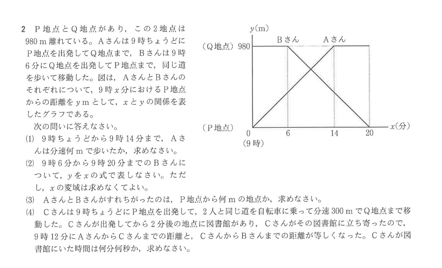 そういう意味では、1次関数の文章題や方程式に関する大問は人を選びます。だから、対策していたからと言って決して再現性高く点数が安定するとは思わない方がいいです。一定ラインできる子でも年によってはハマらず大きく失点するリスクが高いのがこの手の大問の特徴です。